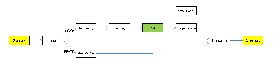 第二次及以后的执行,因为opcache中已有缓存,不需要再解析文件,所以减少了很多操作